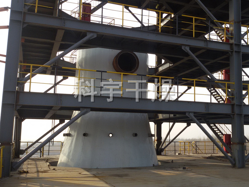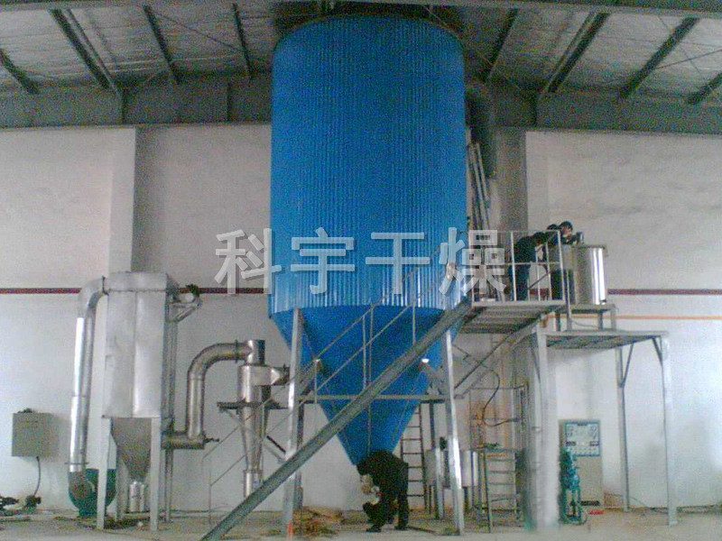 本機組工作過程為料液通過隔膜泵高壓輸入,噴出霧狀液滴,然后同熱空氣并流下降,大部分粉粒由塔底排料口收集,廢氣及其微小粉末經(jīng)旋風分離器分離,廢氣由抽風機排出,粉末由設(shè)在旋風分離器下端的授粉筒收集,風機出口還可裝備二級除塵裝置,回收率在96-98%以上。